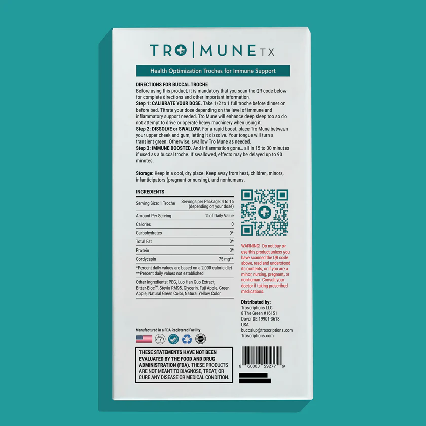 Tro Mune is a physician-formulated immune support troche designed to enhance the body’s natural defenses and support overall immune resilience. Using targeted cordycepin, a bioactive compound derived from the Cordyceps mushroom, Tro Mune aims to support healthy immune function, reduce inflammation, and promote restful sleep. The buccal troche delivery system allows for enhanced absorption as it dissolves between the cheek and gum, supporting rapid uptake of active ingredients.